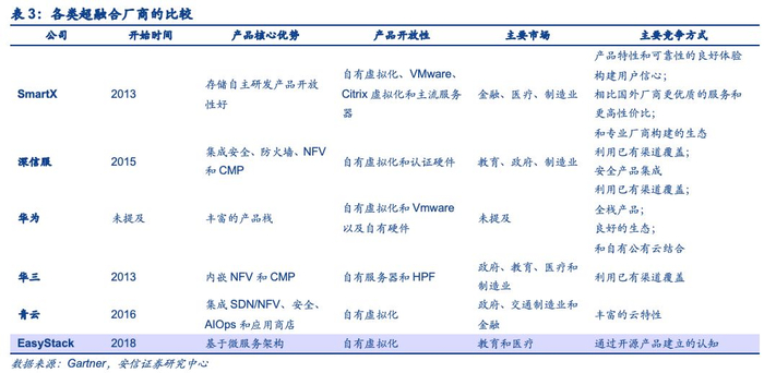 公司超融合产品的特点在于集成了安全性。基于公司的安全基因,其超融合产品亦集成了丰富的安全功能。与其他的竞争对手相比,公司重点领域在教育、政府以及制造业。公司从2009年即开始了超融合和虚拟化技术的研究,2013年推出桌面云解决方案,在2015年发布了超融合4.2新版本产品。