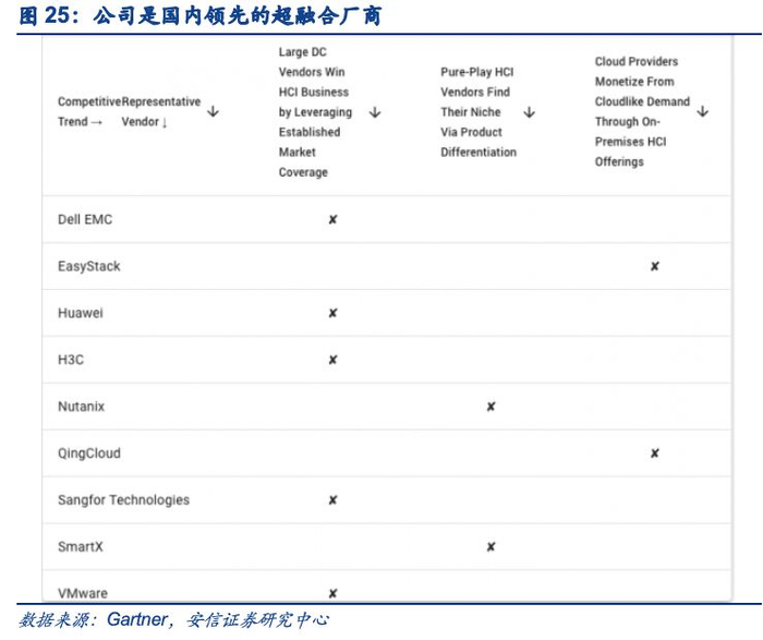 从中国市场来看,公司属于领先企业。根据Gartner的数据,公司超融合产品2018年上半年国内市场排名仅次于华为。从国内超融合厂商的结构来看:第一种是利用渠道赢得市场的大型数据中心厂商:Dell、EMC、华为、新华三、深信服、VMware等;第二种是仅提供软件的厂商:Nutanix、SmartX、ZETTAKIT等,第三种则是使用公有云技术满足私有云需求的公有云厂商:EasyStack、青云等。