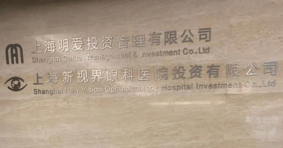 图说:公司名称为上海新视界眼科医院投资有限公司(下称新视界眼科)、上海明爱投资管理有限公司的铭牌。(来源:财联社记者)