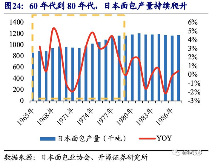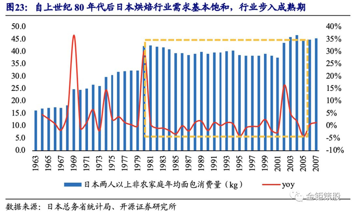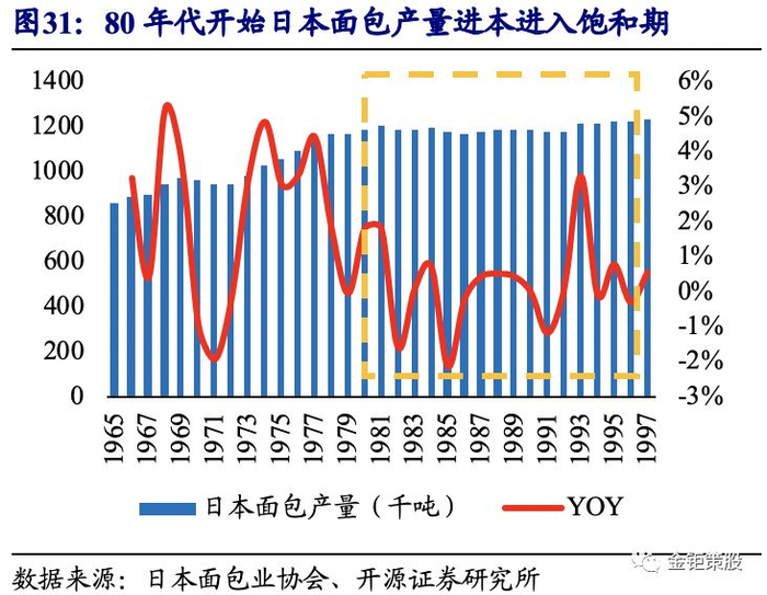 一方面,当前行业的核心驱动力近似日本60-80年代,均为量价推动增长的行业成长期。在二战后美国的援助下,受西方文化影响,日本面包食品迅速普及。1965年日本面包产量为864千吨,时至1980年产量增长至1189千吨。根据日本总务省统计局的数据,1965年日本白面包的价格仅为98.3日元/千克,1980年价格增长至324日元/千克,增长幅度达到229.6%。而我国2018年面包产量的增速为5.4%,面包行业规模的增速为14.5%,均与日本70年代面包产量增速和行业规模增速相近。