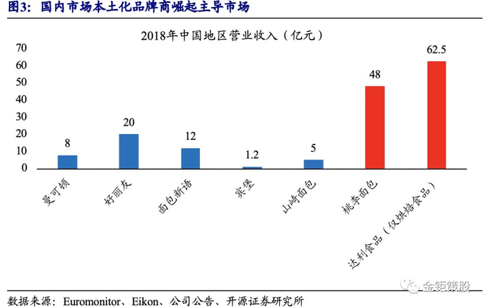 外资进入打开市场,本土化企业崛起主导市场。与其他休闲零食品类类似,国内烘焙零食行业发展之初也存在外资品牌凭借品牌和资本优势的强势进入:1995年,比利时Artal集团在上海投资建厂,生产销售曼可顿品牌面包;1997年,韩国烘焙零食龙头好丽友首次在中国设立工厂进行生产销售;2003年,新加坡烘焙品牌面包新语在中国开设第一家门店;2004年,日本烘焙龙头山崎面包设立上海分公司;2007年,国际烘焙零食龙头宾堡在北京设立子公司,开始中国区域布局。外资品牌的进入快速打开了中国市场对于烘焙产品的需求,同时国内的品牌厂商快速崛起,并且借助本土化的优势,成为市场的主导力量。据Euromonitor 数据,2018年曼可顿、好丽友、面包新语、山崎面包、宾堡在中国地区烘焙食品营业收入分别约为8亿、20亿、12亿、1.2亿、5亿。而本土品牌桃李面包、达利食品2018年烘焙食品的收入已分别达到48亿、62.5亿元,市场份额远超外资品牌。国内品牌厂商的崛起主要优势在于对于国人消费需求理解更为深刻(初期消费者更加看重性价比)以及深度的本地化生产、运输、配送和销售网络。