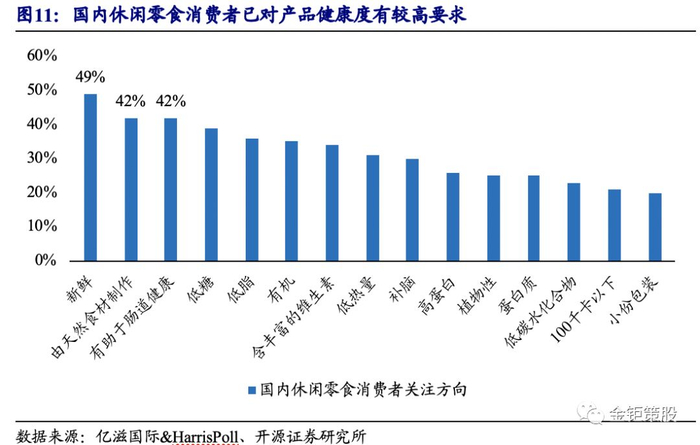 健康化:新鲜、无(少)人工添加剂的中短保烘焙食品正契合消费升级背景下消费者日益提升的健康性需求。烘焙食品按保质期的长短可分为短保(3-15天)、中保(1-2个月)和长保(4-6个月)三大类。国内烘焙行业发展之初,由于缺乏较为成熟的渠道体系,厂商多以经销模式为主,此时拥有较长保质期的产品对渠道端物流配送时间、铺货时间等硬性条件的要求较低。因此以“达利园”、“好丽友”、“盼盼法式小面包”等品牌为代表的长保烘焙食品风靡一时。然而长保烘焙食品为保证其较长的保质期,会在产品中加入防腐剂、保鲜剂等食品添加剂,牺牲掉了一部分的产品新鲜度和健康度。据亿滋国际和HarrisPoll联合发布的全球零食消费趋势报告数据统计,国内已有近四分之三的消费者购买时将关注零食的健康化程度,其中产品的新鲜度、食材的天然性以及是否有助肠道健康分别列居消费者关注度的前三位。中短保烘焙食品口感新鲜且无(少)添加剂的特点正符合“健康化”趋势下消费者的需求,并且随着便利店以及大型商超等现代化零售渠道的建立,短中保烘焙产品能够得以在全国范围内扩张和渗透。目前国内长保烘焙的龙头在长保产品增长陷入瓶颈之后也开始全力推广自己的短保品牌“美焙辰”,驱动公司烘焙业务重回增长轨道。