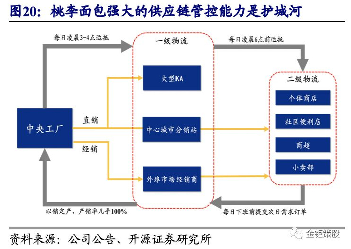 国内短保烘焙龙头,强供应链管控能力铸就护城河。公司是国内的短保烘焙龙头,二十年来在“中央工厂+批发”模式下,以高性价比的产品推动收入持续快速增长。在生产管理方面,公司采取“以销定产”的方式,组织两班人员生产,白天根据预估订单量进行生产,下午下班前统计客户提交次日需求的订单后,在夜间进行补单,以避免短保产品库存积压,进而保证其新鲜程度和周转速度。在物流运输方面,公司将物流体系分为两级,一级物流针对于大型KA、中心城市分销站及各外埠市场的经销商,二级物流是从中心城市分销站将产品配送到周边的中小型商超、便利店等,确保在各地城镇建设差异较大的外埠市场中完成快速配送。在货款结算方面,直营模式下采取账期结算的方式;经销模式下,公司原则上坚持“汇款即发货”,但同时建立信用管理制度,允许少数客户赊销。而对于规模更小的个体商店或社区便利店等则采取现金结算的方式,确保公司保持良好的资金使用效率。在库存管理方面,当天生产出的产品如果出现大量滞销的情况,公司第二天会立即调整生产计划,减少对存在大量滞销客户的送货量。经过多年的经营调整,公司退货率保持在7%左右的较低水平,持续低于行业平均的12%-15%,进而使得公司的过期报损的费用大幅降低,在实现高周转的同时大幅提升利润率。桃李面包通过灵活的订单管理模式、高效的物流运输体系、因地制宜的货款结算方式以及严苛的库存管理制度形成强大的供应链,成为公司在短保领域的重要护城河。