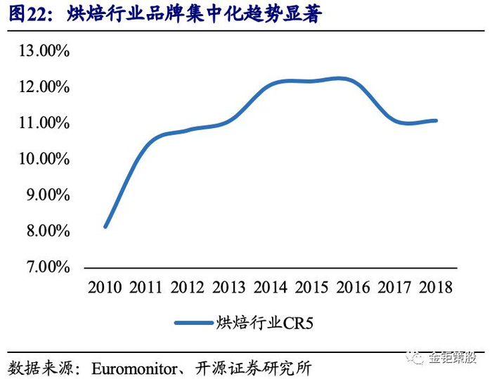 消费升级趋势下,烘焙食品品牌集中化趋势显著。随着经济的快速发展和消费水平的不断提升,人们的消费需求呈现出层次化和多样化的特点,从过去的吃饱,到现在的吃得安全、吃出健康、吃出品位等。目前国内烘焙行业发展处于“量价齐升”的稳健增长期,由于烘焙食品制作门槛较低,下沉市场中仍以无品牌的私人小店为主。近年来,在消费升级的趋势下,品牌化的烘焙厂商获得快速发展,规模以上企业收入不断攀升,行业集中度快速提升。据Euromonitor数据统计,我国烘焙行业的CR5从2010年的8.13%快速提升至了2018年的11.1%。其中由于长保烘焙品牌好丽友在2017年出现了显著的下滑导致CR5在2017年出现了小幅下滑,但不改长期品牌化集中的趋势。对标海外市场来看,与我国饮食结构相近且烘焙同样以零食属性为主的日本CR5已达42.8%,即使是以烘焙为主食的美国、墨西哥、德国和英国,其烘焙行业CR5也分别高达16.7%、20.6%、27%、34.1%。在消费升级背景下,未来我国烘焙行业品牌化集中趋势明确,行业集中度还有很大的提升空间。