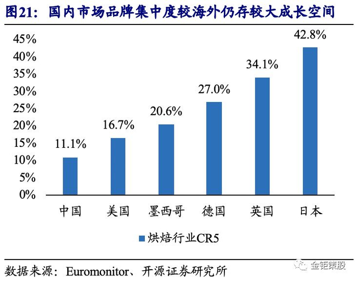 新鲜、无人工添加剂的中短保烘焙食品正契合消费者对烘焙食品日益提升的健康化需求。同时,随着深受西方文化影响的“千禧一代”逐渐成为市场的核心购买力,以中短保烘焙食品代替传统早餐的现象亦日趋显著。烘焙食品健康化、代餐化的发展趋势正助力烘焙食品的消费由长保向短中保升级。而在短中保化的趋势下,高性价比的“中央工厂+批发”模式更优,渠道高周转是王道,而核心在于线下渠道布局和供应链的保障能力。同时,在消费升级的背景下,产品品质更优、更加安全可靠的规模化品牌厂商获得快速发展,我国烘焙行业的CR5由2010年的8.13%快速提升到了2018年的11.1%。对标海外市场来看,与我国饮食结构相近且烘焙同样以零食属性为主的日本CR5已达42.8%,即使是以烘焙为主食的美国、墨西哥、德国和英国,其烘焙行业CR5也分别高达16.7%、20.6%、27%、34.1%。在消费升级背景下,未来我国烘焙行业品牌化集中趋势明确,行业集中度还有很大的提升空间。