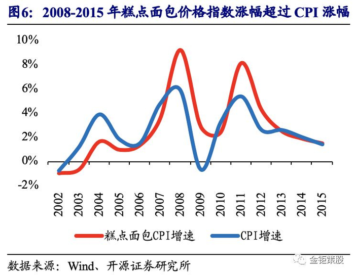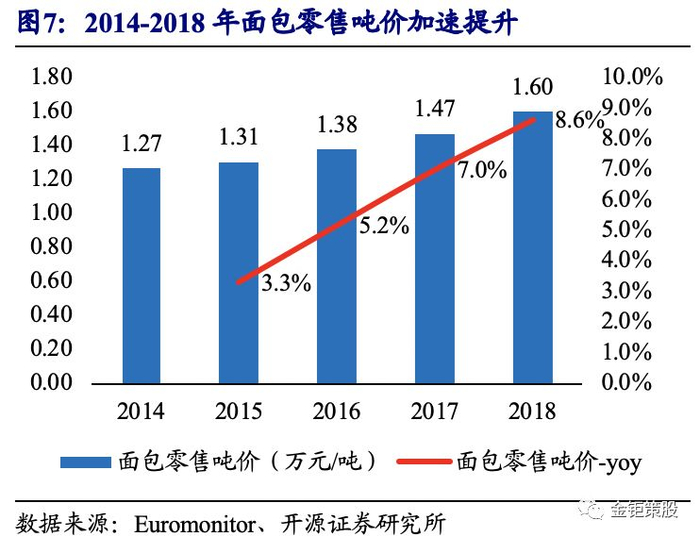价升而言:自2008年以来烘焙行业平均价格指数涨幅超过CPI涨幅,其中在2014-2018年间,面包零售吨价从2014年的1.27万元/吨增长至2018年的1.6万元/吨,同比增长率逐年提升。未来在消费升级的趋势下,产品结构不断优化升级,同时烘焙食品品牌集中度不断提升,品牌效应日益显著,价格也仍然会成为行业增长的重要驱动力之一。