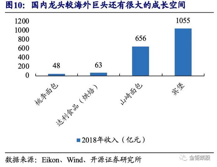 对标海外烘焙食品行业,国内行业和龙头均存在较大的上升空间。从人均消费量的角度来看:据Euromonitor数据统计,2017年国内人均烘焙食品消费量为6.9kg,饮食习惯相近的中国香港和日本地区分别为16.3kg和22.5kg,以烘焙产品为主食的英国、美国则分别为48.5kg与40.2kg,世界平均的烘焙人均消费量亦达到了18.7kg。国内较日本、香港和世界平均水平都有翻倍以上的提升空间,较英国和美国则分别还有5-7倍的成长空间。同时从行业龙头来看,我国烘焙行业长保的龙头达利食品和短保的龙头桃李面包,其烘焙产品的收入规模均不及百亿。而海外的龙头山崎面包2018年的营业收入为656亿元,宾堡2018年的营业收入为1055亿元,国内龙头企业同样有着很大的成长空间。