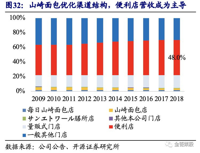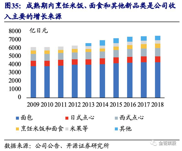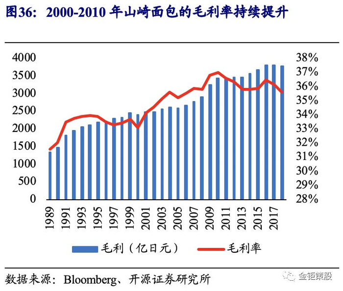发展成熟期,公司渠道铺设完善,传统烘焙产品缓慢增长,并购和新品类拓展成为收入增长的主要来源,新品类拓展和产品结构优化推动毛利率提升。山崎面包共下设有面包、日式点心、西式点心、烹饪米饭面食共四大部门,覆盖于烘焙行业的各个细分子类。其中,面包部门每年有1000多种新产品诞生,精准定位各类客户,推促其营收贡献稳定至60%左右;烹饪米饭面食部门是基于连锁门店商业模式的发展而成立,为面包便利店提供从制造到分销和销售的恒温控制的高质量米饭和面食产品。近10多年来,面包、日式和西式点心等旧品类营收增速持续疲软,收入增长主要来源于并购和新品类在已有渠道的放量。2000年后公司相继并购了金泽德国面包公司、新加坡FOUR LEAVES烘焙公司、日本东鸠休闲零食公司、日本不二家休闲零食公司、日粮面包公司、日本Daitoku Foods面条和调味品公司、Sweet Garden糖果公司和美国Bakewise烘焙公司。不仅继续在全球范围内继续拓展主业,同时拓展了面条以及糖果、薯片、泡芙、曲奇饼、冰淇淋和巧克力等休闲零食的品种。同时可以看到,2009年以来贡献公司收入增量的主要来源为烹饪米饭和面食以及其他品类。同时通过新品类在已有渠道的快速放量以及产品结构的持续优化,公司毛利率在2000-2010年持续提升,2010年之后稳定在36%左右。