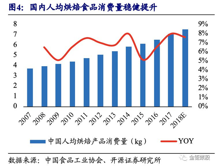 量增来看:据中国食品工业协会数据统计,2013-2017年我国人均烘焙食品消费量CAGR达6.7%以上;据国家统计局数据统计,2011-2018年我国烘焙食品行业规模以上企业数量CAGR达8.2%以上,现已超过1800家。目前我国人均烘焙食品消费量与世界平均水平相比还有很大的提升空间,未来随着国内城镇化率及人均可支配收入的稳健提升、烘焙食品代餐化趋势等,我们认为国内人均烘焙食品消费量仍将继续提升。