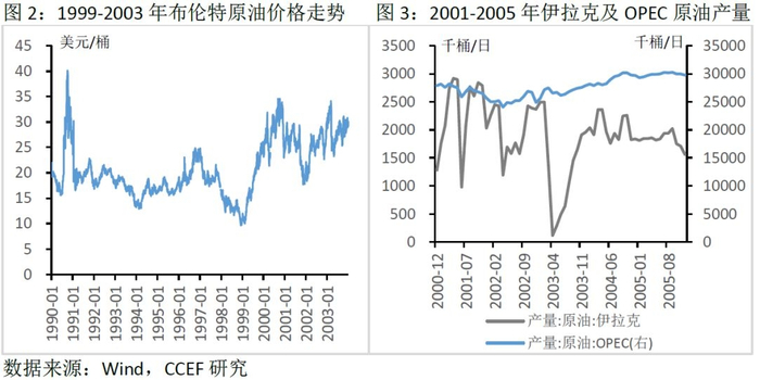 二、历次地缘冲突事件对油价的冲击回顾1. 早期围绕伊拉克的战争冲突:石油产量的收缩带动油价快速上行1990年8月2日,伊拉克军队突然发动对科威特的入侵,联合国决议对伊拉克实施国际经济制裁,以美国为首的多国部队对伊拉克发起进攻。伊拉克和科威特石油产量因此大幅下滑,导致第三次石油危机的爆发。1990年8月海湾战争爆发,两个月后,即1990年10月,油价从18.36美元/桶上涨至40.15美元/桶,涨幅高达119%。不过,以沙特为首的OPEC 国家迅速增产以稳定原油市场,油价也逐渐回落。