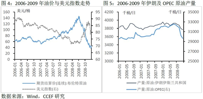 2003年3月20日,美国绕开联合国安理会,单方面对伊拉克实施军事打击,伊拉克战争爆发,导致伊拉克原油产量快速收缩,从2500千桶/日跌至2003年4月的118千桶/日。由于伊拉克石油设备在战争中受损严重,美国石油库存处于较低水平,同时叠加尼日利亚发生罢工等因素,油价持续四个月上涨。布伦特原油价格自战争爆发前的25.46美元/桶上涨至2003年6月的34.10美元/桶,涨幅达到34%。2003年4月,伊拉克战争的主要军事行动结束,随着OPEC原油产量的恢复,油价也自高位回落。2. 伊朗核问题是油价快速上行的催化剂伊朗核问题是导致油价自2007-2008年快速上升的因素之一。2006年1月初,伊朗公开宣布恢复中止两年多的核燃料研究工作,2006年3月,安理会正式介入伊朗核问题。由于伊朗拒绝停止开展铀浓缩活动,自2006年12月开始,安理会先后进行多次决议,对伊朗实施多方位的制裁。由于伊朗拥有全球近10%的石油探明储量,同时为OPEC的第二大产油国,尽管原油产量未受到明显影响,但是伊朗核问题升温对于2007-2008年国际油市的心理预期产生了重大影响,布伦特原油自2007年1月的51.7美元/桶持续上涨至2008年7月的146.08美元/桶,涨幅高达282%。当然,这其中也有原油整体需求旺盛及原油产能难以扩张带来的供求缺口和美元持续疲软等因素。