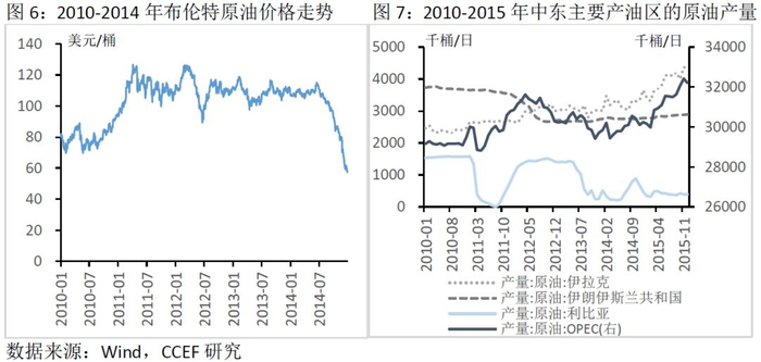 3. 中东地区持续的地缘冲突是油价在供求宽松的环境下没有快速下行的重要原因2011-2014年,全球处于石油库存高企同时需求减少市场环境下,但油价却没有相应回落,主要原因就是中东地区持续的地缘政治动荡。2011年开始的“阿拉伯之春”革命浪潮,导致许多国家的原油产量大幅下滑,尤其是主要产油国利比亚。利比亚原油产量从2011年2月的1600千桶/日直线降至8月份的7千桶/天,加上2012年的伊朗原油禁运事件导致布伦特原油价格自74.26美元/桶上涨至2012年9月的126.65美元/桶,涨幅达到70%。2013年,利比亚罢工事件使得其石油产量再次下滑,产能减少约120万桶/日。同年,埃及发生暴力冲突,叙利亚化学武器袭击也加剧了中断地缘政治的紧张局势,引发市场对未来原油中断的担忧。2014年上半年,伊拉克内战扩大,引发市场对于石油供应的担忧, 2014年下半年,乌克兰危机使得欧美联合对俄罗斯实施金融、能源、军工等领域的多轮制裁,但是乌克兰本身不是产油国,对全球石油供应影响十分有限,且伊拉克内战对产油量没有重大影响。因此2014年地缘冲突对于油价的影响程度要弱于以往,2014年下半年之后,油价大幅下行。