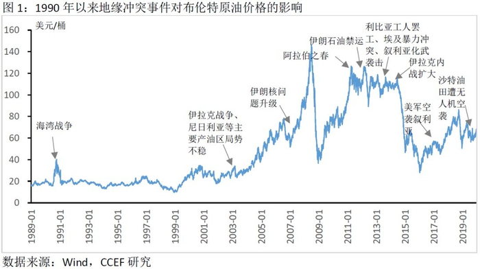 原油价格的长期走向取决于其供求关系,但作为一种战略性能源,其短期价格易受地缘政治因素的扰动。战争、石油禁运、限产、恐怖袭击等事件会严重扰动石油价格的波动。从1990年以来的国家地缘政治冲突事件来看,不同类型和时期的事件对油价的冲击力度和持续时间有所差异。国际地缘冲突对油价的影响程度主要取决于事件本身是否能够对原油的供给需求产生实际且具有持续性的影响。一方面,这与地缘冲突对于石油生产的影响以及市场后续情绪的发酵有关,发生在主要产油国和主要战略国的地缘冲突事件的影响程度较大,如伊拉克、伊朗、利比亚、叙利亚等国;另一方面,也与当时油价的基本面及美元走势有关,当石油需求较强时,如1990年的科威特战争、2003年的伊拉克战争以及2011年“阿拉伯之春”,表现为催化剂效应,都对当时油价带来较大冲击。而发生在石油弱需求时期,如2013年利比亚罢工事件、2014年伊拉克内战扩大,则对油价影响程度有限。