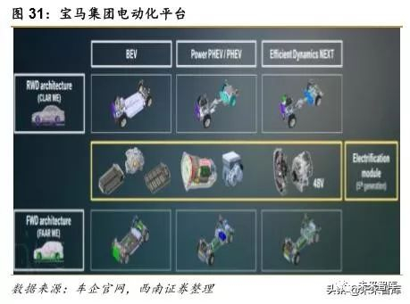 宝马集团共有两个平台生产电动汽车:后驱的 CLAR(cluster architecture)平台和前 驱的 FAAR 平台,两个平台都具有通用性,可以生产 BEV、PHEV 等动力车型,拓展性强。其中,CLAR 平台主要用于生产 3 系、4 系、5 系及对应的 SUV 等中高端车型,FAAR 平台 主要用于生产 1 系、Mini 等入门级的车型。