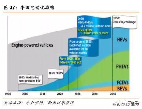 丰田在电动化上起步相对较晚。丰田 2017 年底才提出在 2020 年率先在中国推出纯电 动车型,2030 年在全球销售 550 万辆/年的电动化车型,包括 100 万辆的纯电动和燃料电池 车。2019 年更新了电动化战略,将于 2025 年实现全球年销售 550 万辆电动化车型的目标, 包括 100 万辆纯电动汽车、50 万辆 FCEVS、200 万辆 PHEV 和 200 万辆 HEV,比原计划 提前五年。另外,丰田计划到 2025 年将所有车型都实现电驱动。