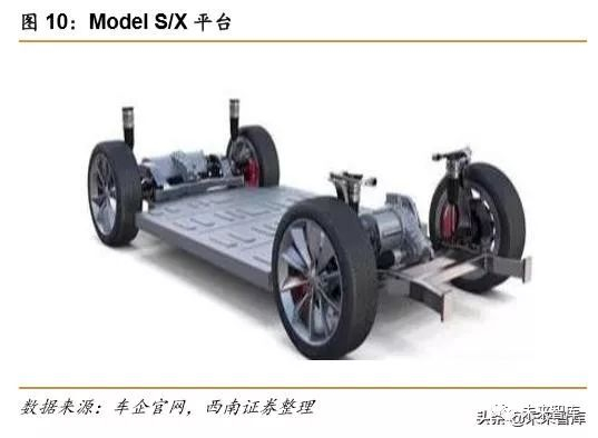 特斯拉的平台主要有两个:Models S 和 Model X 共用一个平台、Model 3 平台,Model 3 平台轴距比 Model S/X 平台轴距缩短了。Model S/X 平台电池横贯于底部,使重心降低,平衡整车重量,前后配重基本达到 50:50;可以搭载三种容量的电池,满足不同续航要求;采用双电机结构,优化电机效率,实现四驱。Model 3 平台也同样将电池组安装在底盘,整 车中信位于车辆底部中间,使整车重量平衡分布;采用双电机全轮驱动模式,前悬架采用双 横臂独立,后悬架采用五连杆独立式,悬架高度低,使整车重心降低。