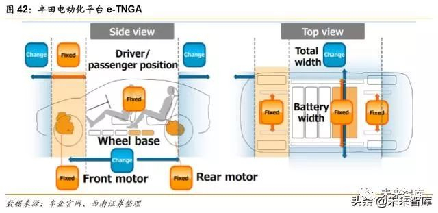 e-TNGA 是在 TNGA 基础上发展的纯电动平台,是和斯巴鲁合作开发的。架构中前后电 动机的位置、驱动模块、驾驶员相对于前轮的位置以及电池模组的宽度是固定的,电池模组 可根据不同续航里程增加,每块模组是同样的结构,能够实现电池模组的标准统一以方便控 制成本。除此之外,在 e-TNGA 架构中,车辆前后悬距离、轴距长度、车宽以及离地距离都 能够改变。