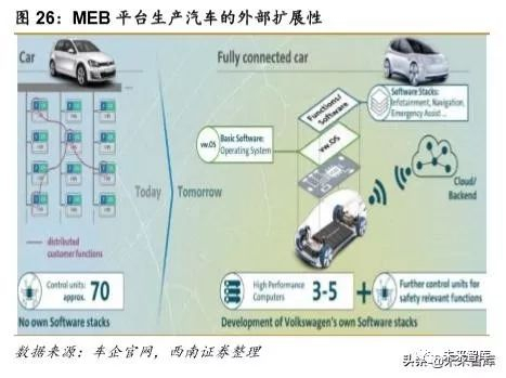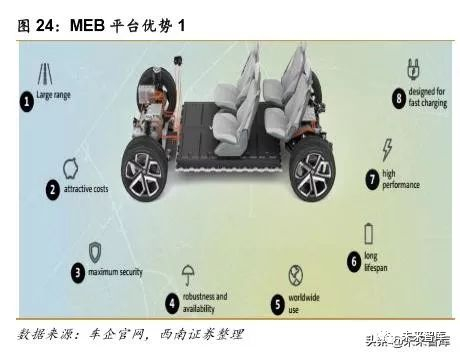 MEB平台拥有较大的延展性和模块化,能够适应前驱/后驱/全驱等各种不同的驱动系统, 可根据不同车型的用途,配置不同容量的电池。支持快速充电,15-30 分钟内即可充满 80% 的电量;采用轻量化铝质零件,并配有集成式冷却系统和电池管理系统,大幅度提升电池防 护水平;全新的车载网络 vw.OS 操作系统,采用无线更新的方式,让汽车变成了“车轮上的 平板电脑”。另外,为智能联网也做好准备,可在平台上实现全新的车载辅助系统、舒适系 统、信息娱乐系统、控制和显示系统的集成。