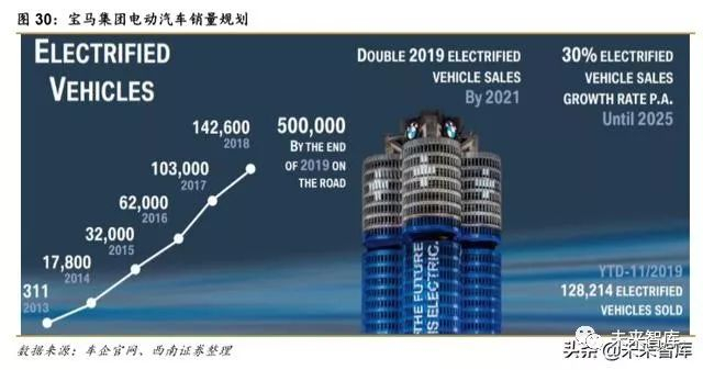 宝马集团是豪华品牌中推动电动化最积极企业之一,从 2013 年开始已经生产电动汽车, 未来也还希望扮演先驱者角色。宝马集团提出到 2023 年,至少推出 25 款电动汽车,包括至 少 13 款纯电动车型,比原计划提前 2 年;到 2021 年,电动汽车全球销量达到 2019 年的 2 倍,到 2025 年,电动汽车全球销量占比达到至少 30%,其中,在欧洲市场,到 2021,达 到 25%;到 2025 年,升至 33%,到 2030 年提高至 50%。