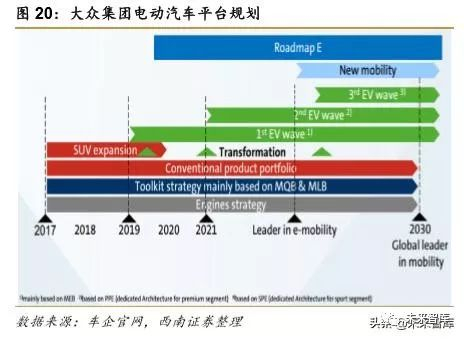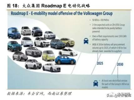 2015 年大众深陷“排放门”,被处罚 270 亿欧元,10 月 10 日召开技术转型会议,10 月 13 日,宣布将开发 MEB 电动汽车平台,为市场提供价格亲民、可盈利、规模化的电动汽 车。2016 年,大众发布 2025 战略(TRANSFORM 2025+);2017 年,大众发布「Roadmap E」电动化战略,开启全面转型电动化的大幕。