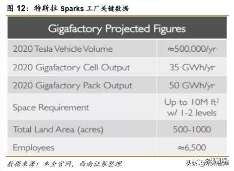 内华达州超级工厂是世界上最大的电池工厂,且每kWH电池生产所花费的成本支出最低。该工厂是特斯拉和松下合作生产,松下负责生产和供应圆柱形电芯,特斯拉基于电芯生产电池 模组和电池包,完成电池的最终生产,2020 年电芯产能达到每年 35GWh,电池包产能达到 每年 50GWh,将超过 2013 年全球所有其他动力电池供应商的总产能。