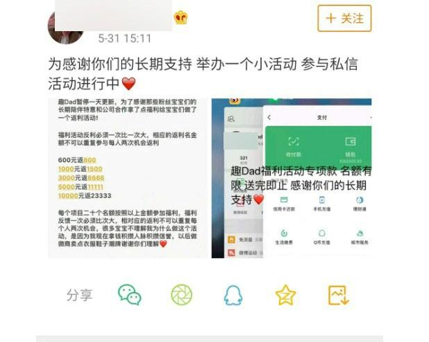 前两年傍着热门综艺火起来的中奖诈骗也摇身一变,玩起粉丝福利的“普惠模式”。 骗子会利用一些具有一定粉丝量的社交平台账号,发布回馈粉丝活动,实际是简单直接的红包返利活动,通过诱导受害人参与大额返现狠骗一笔。不明真相的受害人觉得博主有一定的粉丝量和影响力,再加上自己想贪小便宜的心理就参加了此类活动,最终被骗。