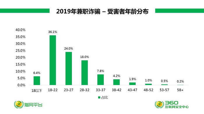 报告还对兼职诈骗做了深入剖析。在兼职诈骗受害者中,大学生首当其冲,报告称,18至22岁人群为最大受害群体,占比36.1%。该年龄段人群一般多为社会经验尚浅的大学生。