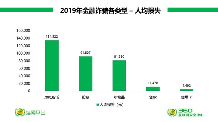 此外,金融诈骗追风口的能力也令人咋舌,从各类型金融诈骗造成的人均损失来看,虚拟货币诈骗导致的人均损失最高,为134522元,骗子打着“区块链”、“数字货币”、“比特币”、“挖矿”的旗号行骗。