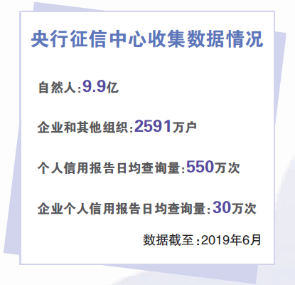 根据央行副行长朱鹤新2019年6月在国新办吹风会上透露的数据,央行征信中心已累计收集9.9亿自然人、2591万户企业和其他组织的有关信息,个人和企业信用报告日均查询量分别达550万次和30万次,是全球规模最大的征信系统,在防范金融风险、维护金融稳定、促进金融业发展等方面发挥了不可替代的重要作用。