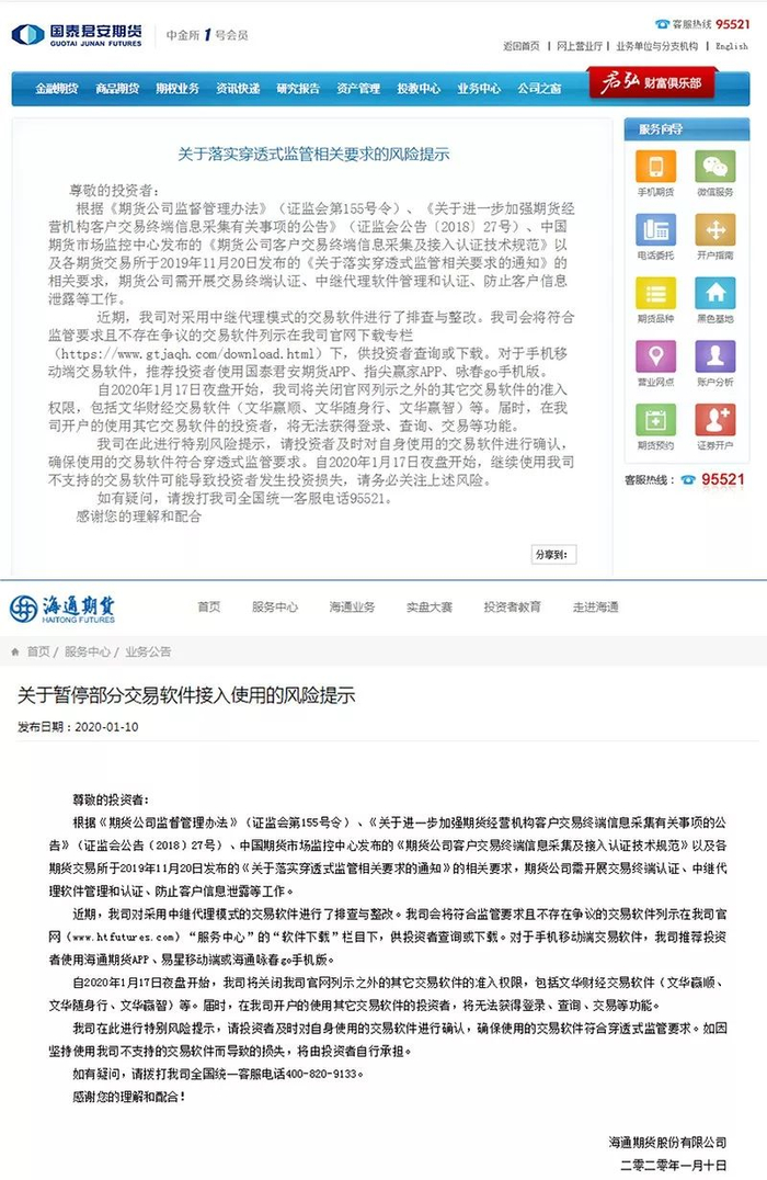 以永安期货为例,其官网公告显示,永安期货将自2020年1月17日结算后起,关闭其他软件的准入权限,包括文华财经交易软件(文华赢顺、文华随身行、文华睿期、文华赢智和文华库安等)。届时,使用此类软件的投资者,将无法进行交易登录,无法使用查询、交易等功能。