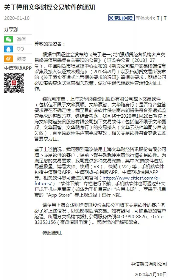 另外,文华财经强调,监管要求1月20日前完成升级,一些大公司正升级系统,1月20日之前,文华财经会在官网公布继续支持它的期货公司。