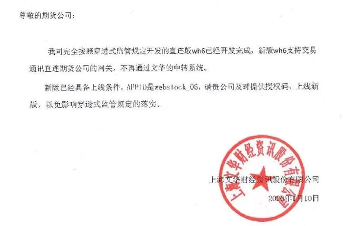 据悉,今日,在众多期货公司发出公告前,文华财经向各家期货公司发出了一则通知,通知称文华财经完全按照穿透式监管规定开发的直连版wh6已经开发完成,新版wh6支持交易通讯直连期货公司的网关,不再通过文华的中转系统。然而,各家期货公司却并不接受。