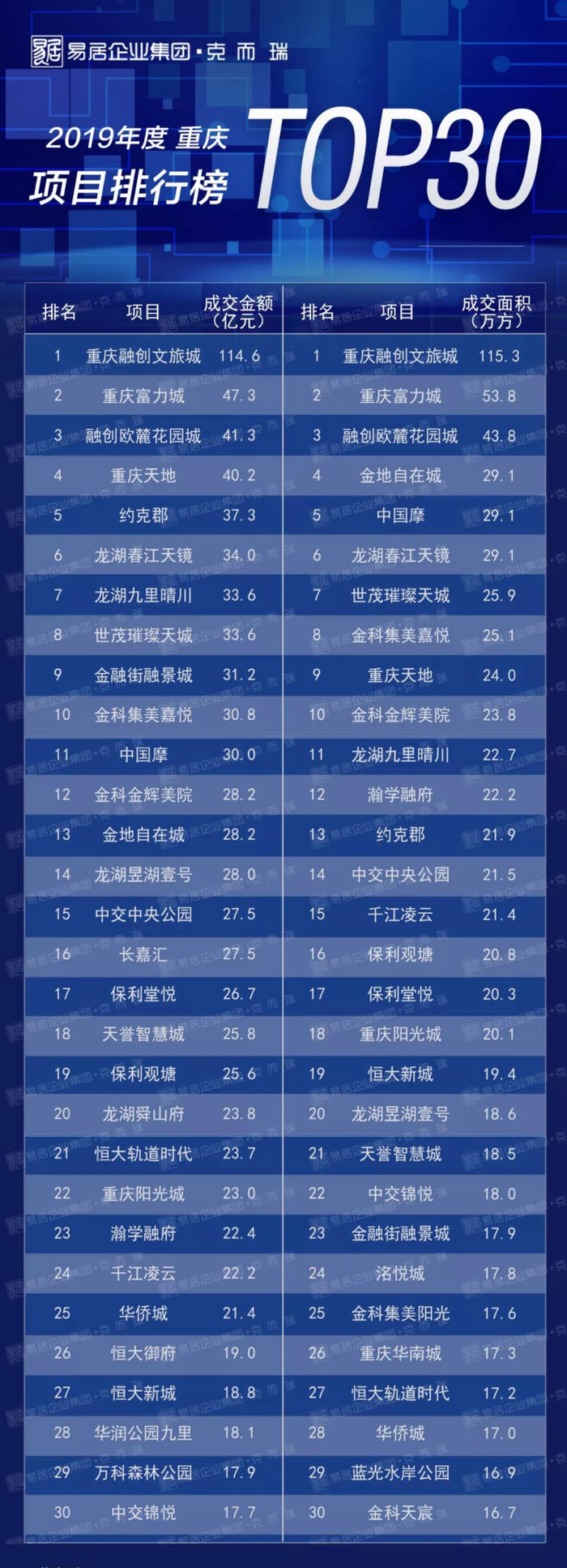 日前,根据克而瑞最新发布的“2019年重庆项目排行榜TOP30”榜单显示,融创旗下两盘进入前十,分别为重庆融创文旅城和欧麓花园城。