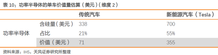 对比传统汽车和新能源汽车(以Tesla为例)的含硅量以及功率半导体在车用半导体中所占比例来测算车载功率半导体的单车价值量提升,我们预计单车的价值量从71美元上升至355美元。