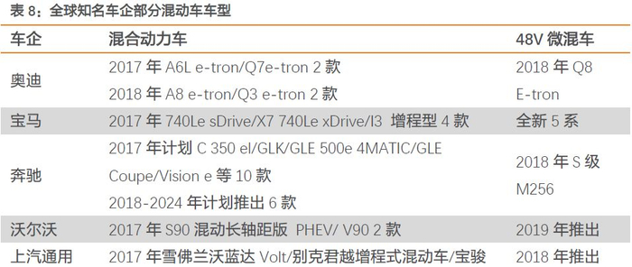 微混车受到各大主流车企的追捧:微混车很好的解决了节能减排和转型成本之间的难题,具有广阔的应用前景,世界各大知名车企纷纷推出48V微混车型:2016年,奥迪SQ7配备了48V电池;2017年,宝马全新5系搭载48V电动系统;2018年,奔驰将推出S级M256,这是奔驰首款搭载48V微混系统的车型。