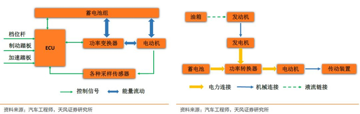 相对于纯电动车完全靠电机驱动,混合动力车的驱动系统主要由电动机、动力电池、发动机组成。车辆在正常行驶时,发动机通过发电机将电能传递给功率转换器,进而驱动车轮;在启动或低速行驶时,通过蓄电池将电能传递给功率转换器;在遇到坡道或急加速时,发动机和蓄电池共同传递能量驱动车辆行驶。混动车只需用到一种燃料而不需外部充电,蓄电池的能量来自于发电机输出的多余电能以及减速/制动模式下驱动轮的动能。