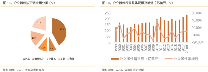 分立器件是重要的电子元器件,广泛应用在计算机、通信、消费电子、汽车电子、工控等领域。目前全球分立器件的市场规模在200亿美元左右,其中汽车领域占比约为42%,是最大的应用市场。