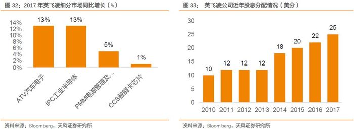 我国市场一直是英飞凌近年来最重要的销售市场,根据2017年年报显示,英飞凌中国大陆地区收入为19.67亿美元,占英飞凌收入的25%(2016年占比为24%)。随后排名是德国,营收为12.41亿美元,占15%(2016年占比15%),美国为8.1亿美元,占10%(2016占比为10%),日本为5.25亿美元,7%(2016年占比为6%)。英飞凌近年的股息分配也较为慷慨,一直稳步增长中,2016,2017财年是每股股息分别为22、25美分。