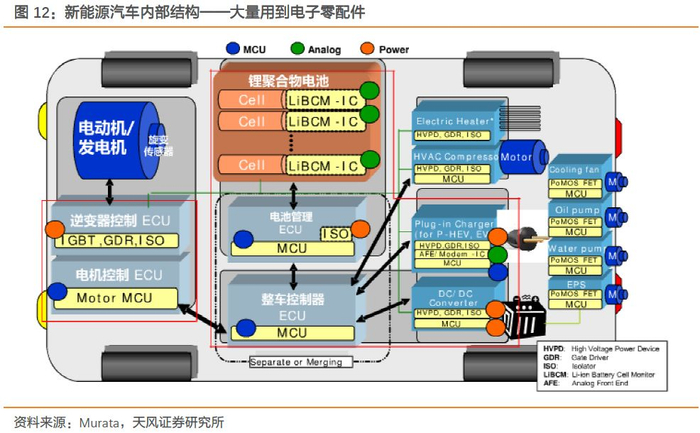 汽车电池电压的变化带来更多的电子零部件需求(功率半导体、被动器件);同时催生既有零部件升级更新的需求(继电器、连接器、线缆、被动器件等),将有效打开汽车电子企业成长天花板。我们下一节将针对这些变化作详细阐述: