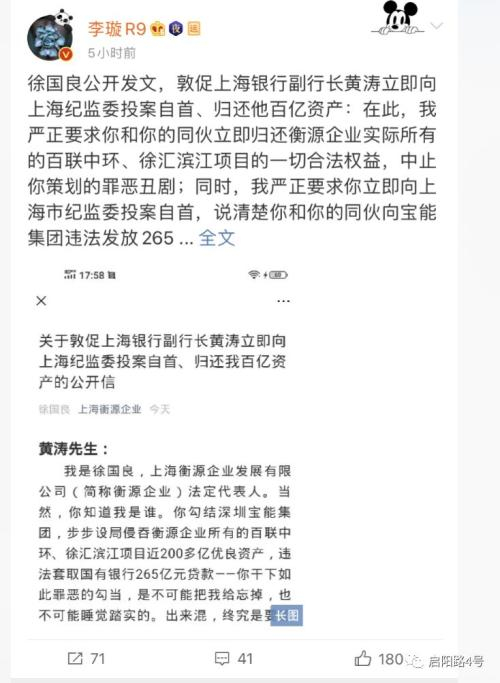 上海申鑫足球俱乐部老板、上海衡源法人徐国良疑似通过公众号“上海衡源企业”发表公开信,举报上海银行副行长黄涛。