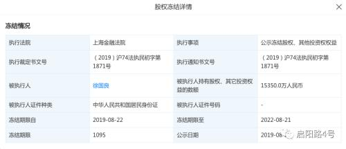而在同年9月20日,上海衡源再次爆出股东冻结信息。据上海市第二中级人民法院公示,徐国良持有的15350万元股权被冻结,冻结期限从2019年9月20日至2022年9月19日。