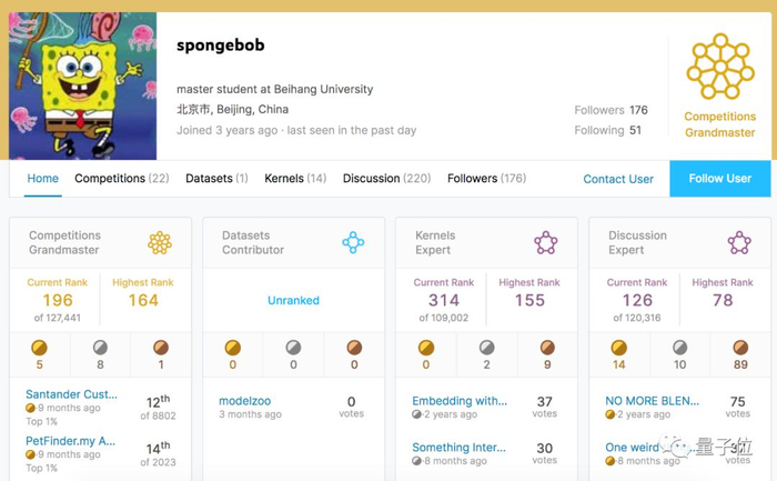 也正是因此,排行榜上后面的所有参赛者名次都提升了一名,北航硕士spongebob进入了金牌获得者名单,刚好凑够了Kaggle竞赛的第五枚金牌和第一枚个人金牌,顺利升级成了Kaggle Grandmaster 。