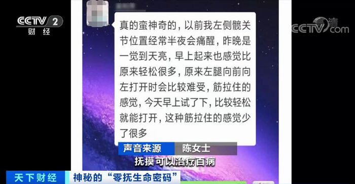陈女士:她上面说的就是抚摸可以治疗百病,她是叫我们去学,还可以帮我们隔空治疗,在外地工作,家里有老人有什么毛病,可以用心灵去感应。