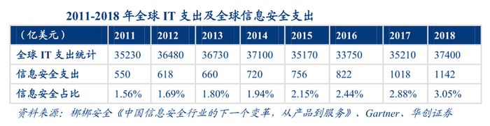 根据 Gartner所做统计来看,信息安全支出占整个IT支出的比例越来越高,2018年全球信息安全支出占IT支出的比例为3.05%。