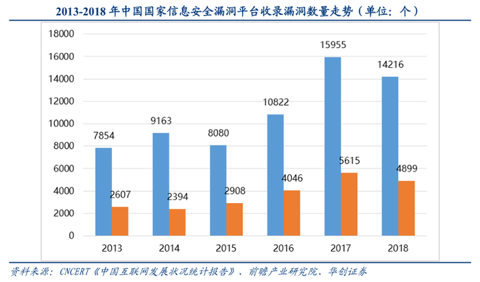 根据《中国互联网发展状况统计报告》数据显示,2013-2018 年我国信息安全漏洞平台收录漏洞数量逐年增加,2018年漏洞数量达到14216个,其中高危漏洞数量达4899个,占全部安全漏洞数量的占比高达34.5%。