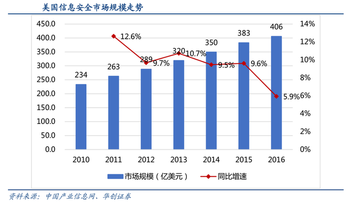 截至2016年,美国网络安全市场规模超过400亿美元,进入平稳增长阶段。