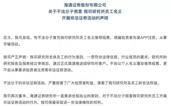 根据公告,有不法分子冒充海通研究所员工名义推荐股票,而最终的目的,是诱骗投资者向某APP注资,从事诈骗活动。