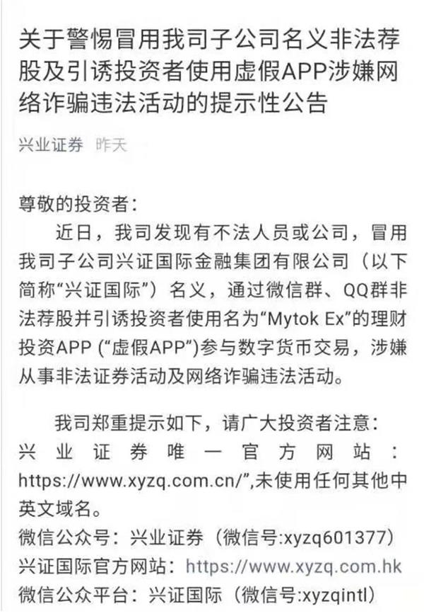 昨日,兴业证券在其官方微信公众号中公告:“近日,我司发现有不法人员或公司,冒用我司子公司兴证国际金融集团有限公司名义,通过微信群、QQ群非法荐股并引诱投资者使用名为”Mytok Ex“的理财投资APP参与数字货币交易,涉嫌从事非法证券活动及网络诈骗违法活动。”