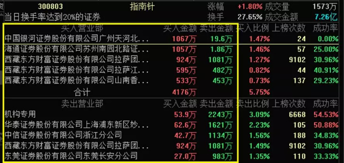 言简意赅,不一一解释了。比如某个交易日指南针日换手率超过20%,达到上榜标准,东方财富展示的龙虎榜是下图这样的。买入前五、卖出前五的席位名称以及各自买入、卖出金额都标注得很清楚。