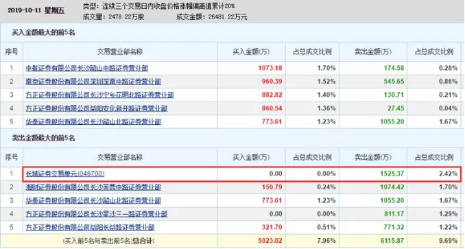虽然交易单元在龙虎榜里比较少见,但是偶尔还是能看到,比如红宇新材2019年10月11日龙虎榜,卖一席位显示的就是长城证券交易单元。